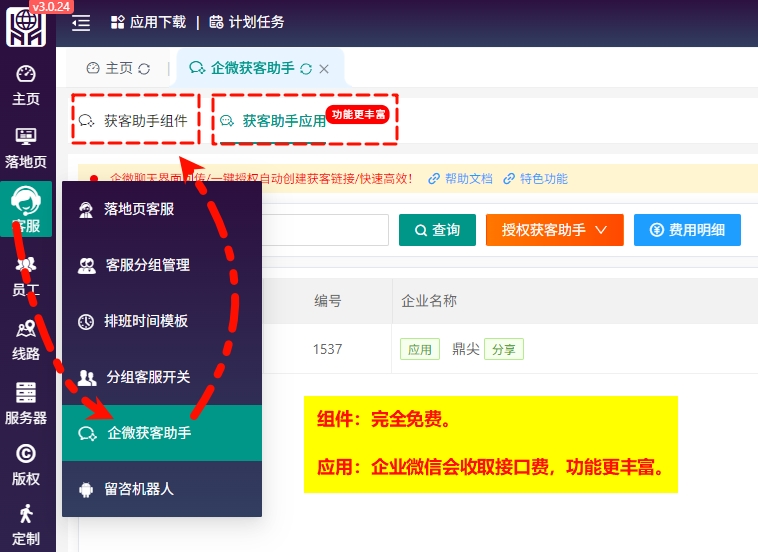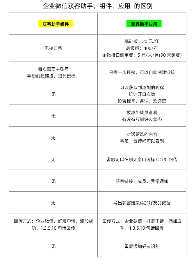 这里客服的获客连接的添加又分2种情况: 2、在鼎尖系统里面添加1个客服,企业微信获客连接中对应多个成员,通过企业微信获客助手人员管理,来控制展示,你要开关客服,也只能通过企业微信里面,移出,选入成员来控制。 ⑥ 企业微信也有更丰富的自动回传方式提供选择。 最后:丰富的唤起企业微信方式。 企业微信删除方式: 差异对比: 企业微信获客助手-组件,应用的功能区别有哪些?