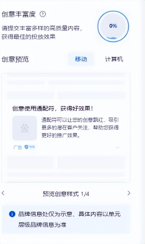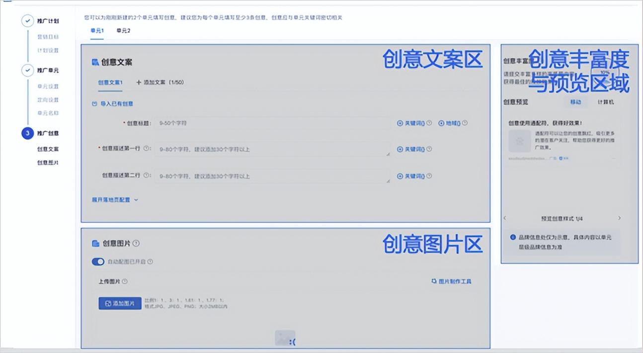 百度推广创意页面搭建教程:自动配图、创意丰富度优化技巧发表时间:2026-02-18 11:00 百度搜索推广:新建创意页面操作流程及常见问题![]() 1.文案区 ![]() 2.图片区 ![]() ![]() ![]() ②点击“添加图片“,四种比例图片(1:1;3:1;1.61:1;1.77:1)支持选择,只需选择想要投放的图片,系统会基于您上传图片的比例以及数量,自动匹配图片样式,可能会覆盖原单图、大图、多图(移动三图,计算机四图)等样式 3.创意丰富度与预览区 ![]() 二、常见问题 |